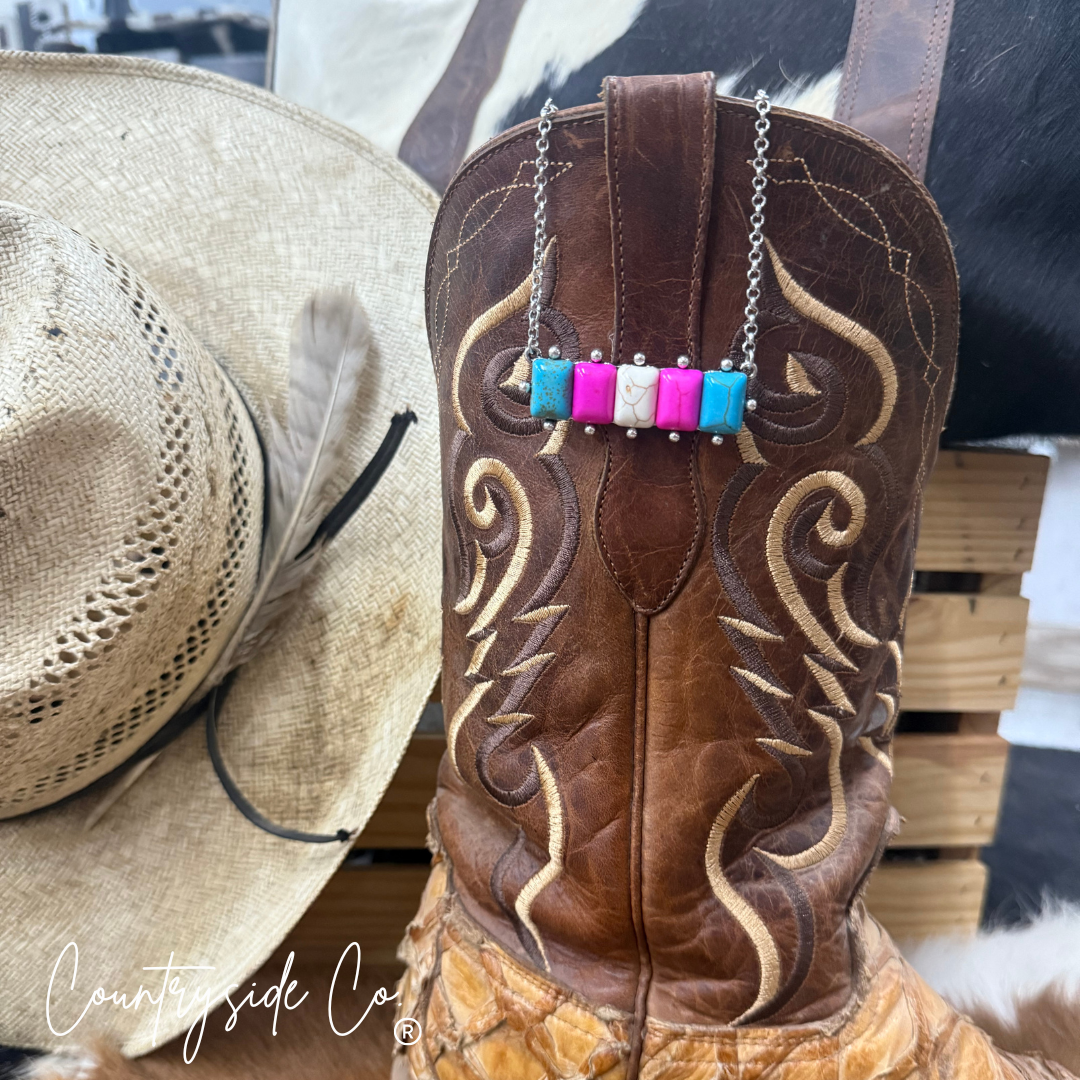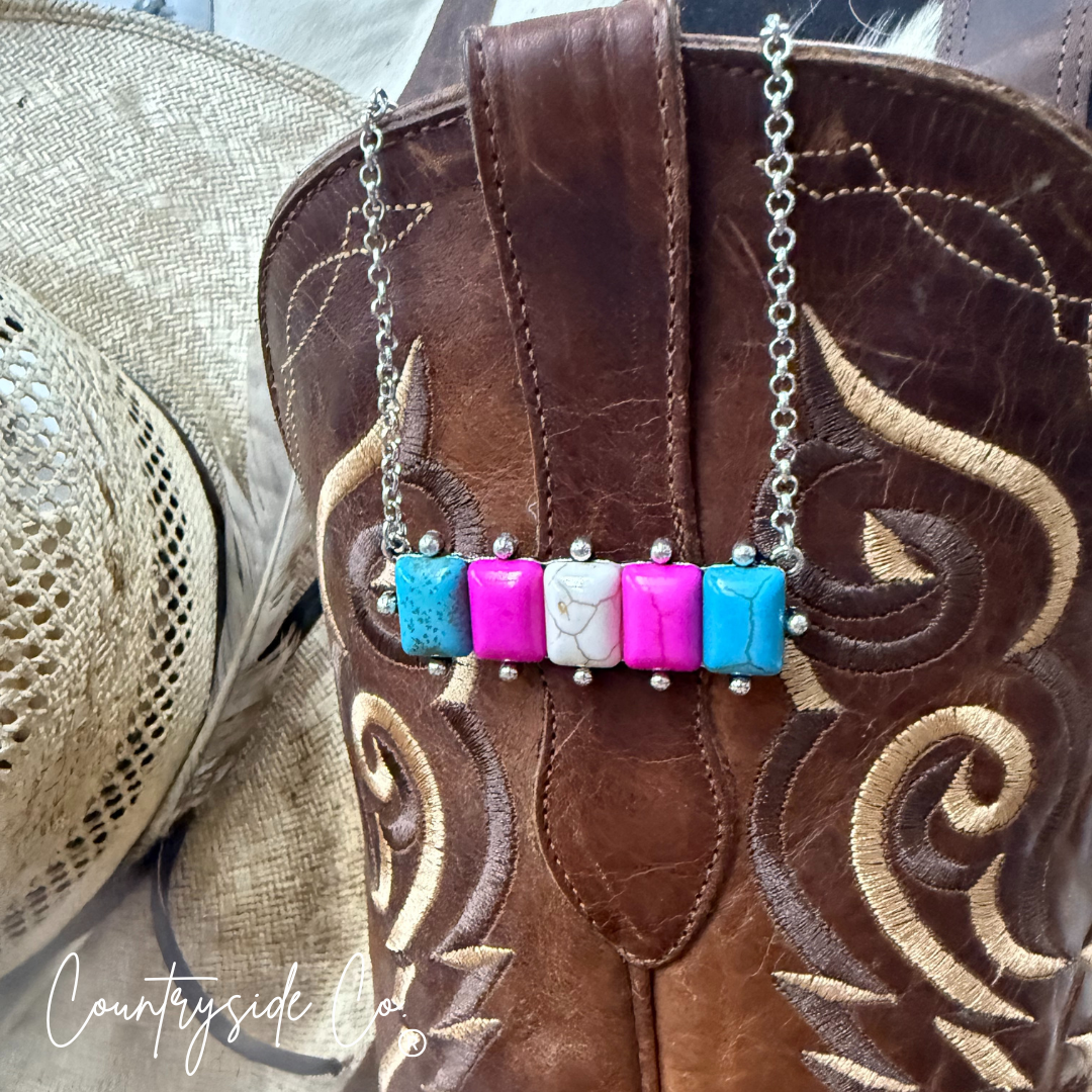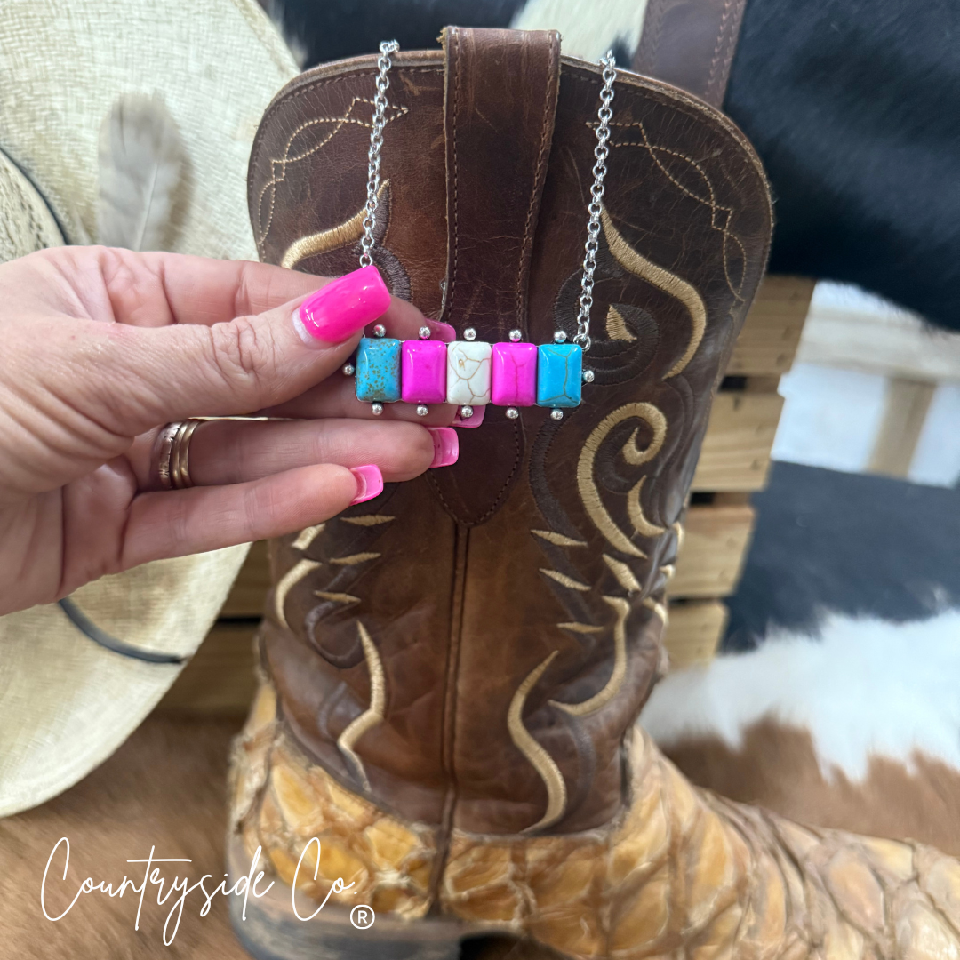 The Cotton Candy Necklace dazzles with a charming mix of pink, turquoise, and natural faux stones set in a detailed design. Its adjustable clasp makes it easy to wear just right, and the 2-inch setting adds a sweet pop of color to any look. A fun and stylish choice for anyone who loves a playful, handcrafted vibe.