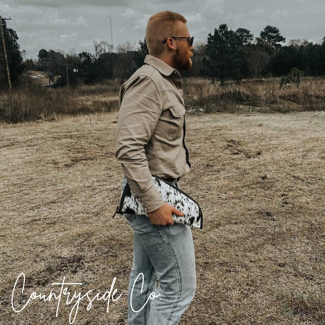 This Cowhide 15' Carry Case is the perfect accessory.. Crafted from cowhide and leather, this 15 inch padded carry case is sure to make a statement. Every case is one of a kind, as each new case is made with a unique new cowhide. The carry case is perfect for travel. The interior is made of a soft padding.