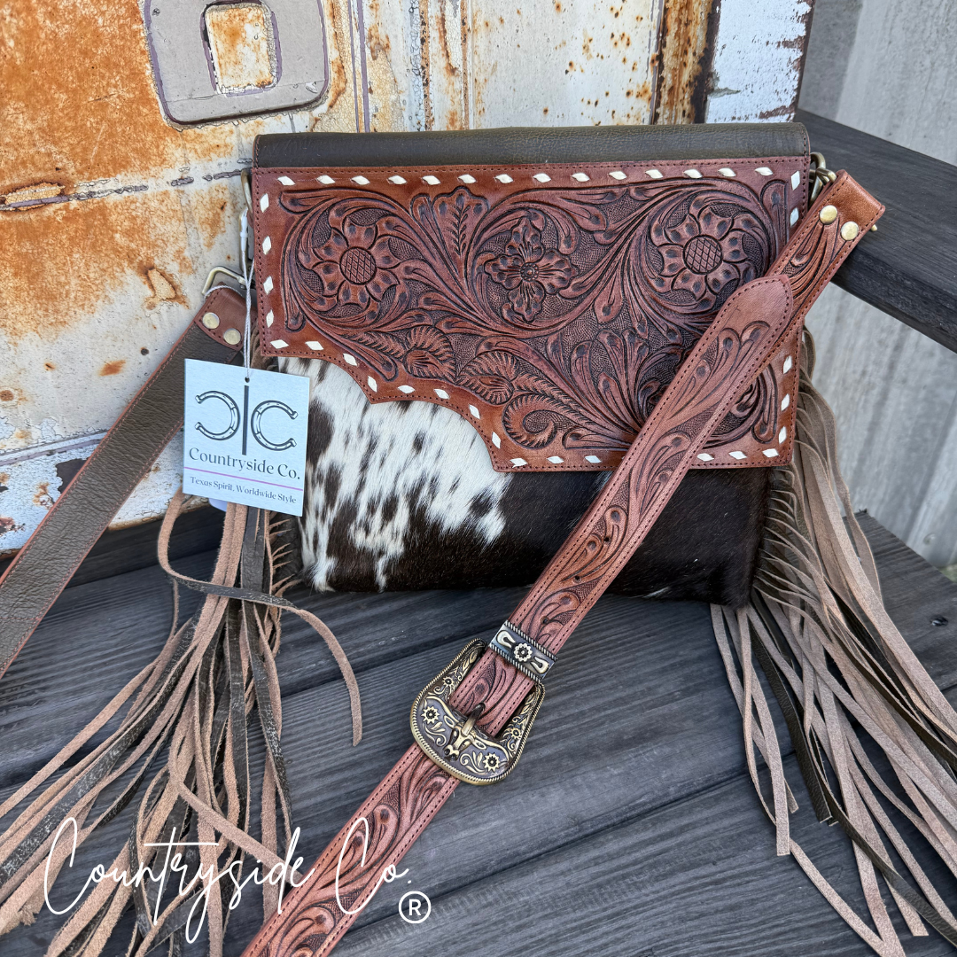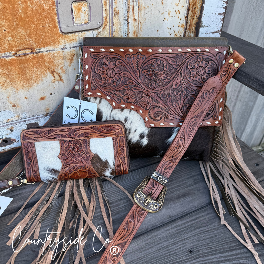 Get ready to turn heads with the Georgia Conceal Carry Purse and Wallet Bundle! Crafted from genuine tooled leather and hair on cowhide, this duo offers style and security all in one. Perfect for those who want to keep essentials close and classy while saving with this matched set. Carry confidence and charm wherever you go. Save $25.00 with this bundle, while supplies last. The pictures are for reference each item is made with genuine unique cowhides.