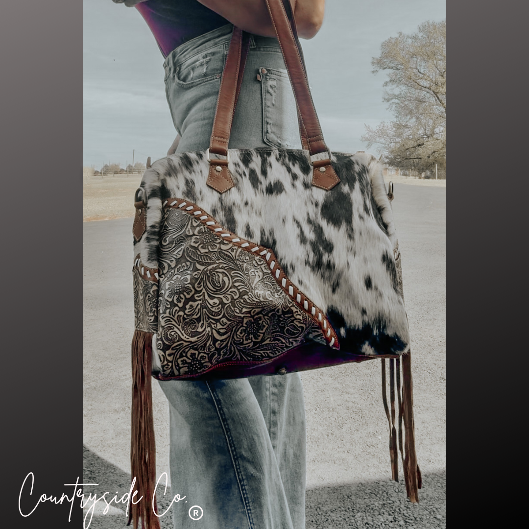 The Laramie Cowhide Leather Concealed Carry Handbag is made to stand out. The front features embossed leather with leather details and cowhide. The back is leather with two conceal carry pockets. There is also a leather detachable shoulder strap that is adjustable and has an silver accent. Every bag is made with unique cowhides so no two are alike.
