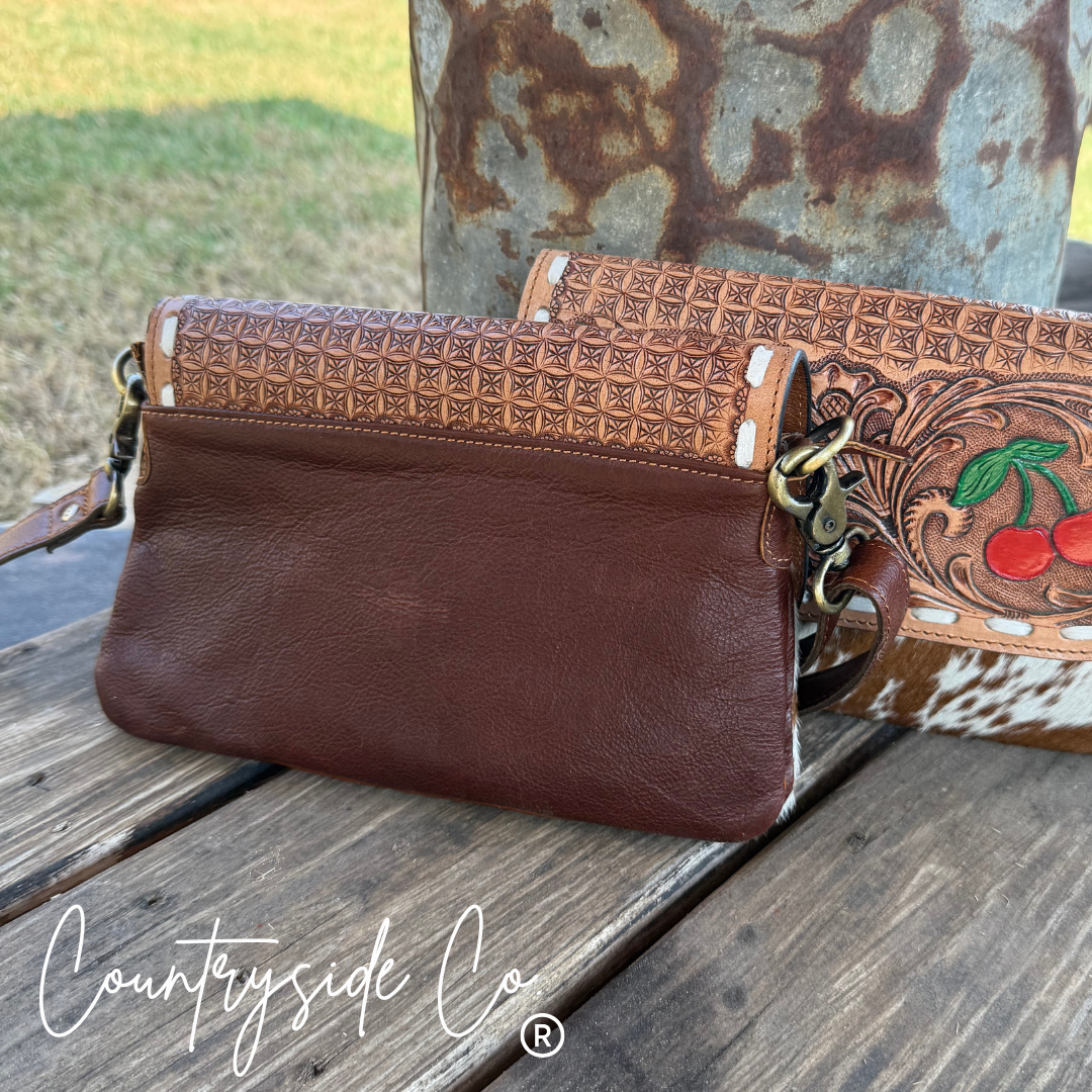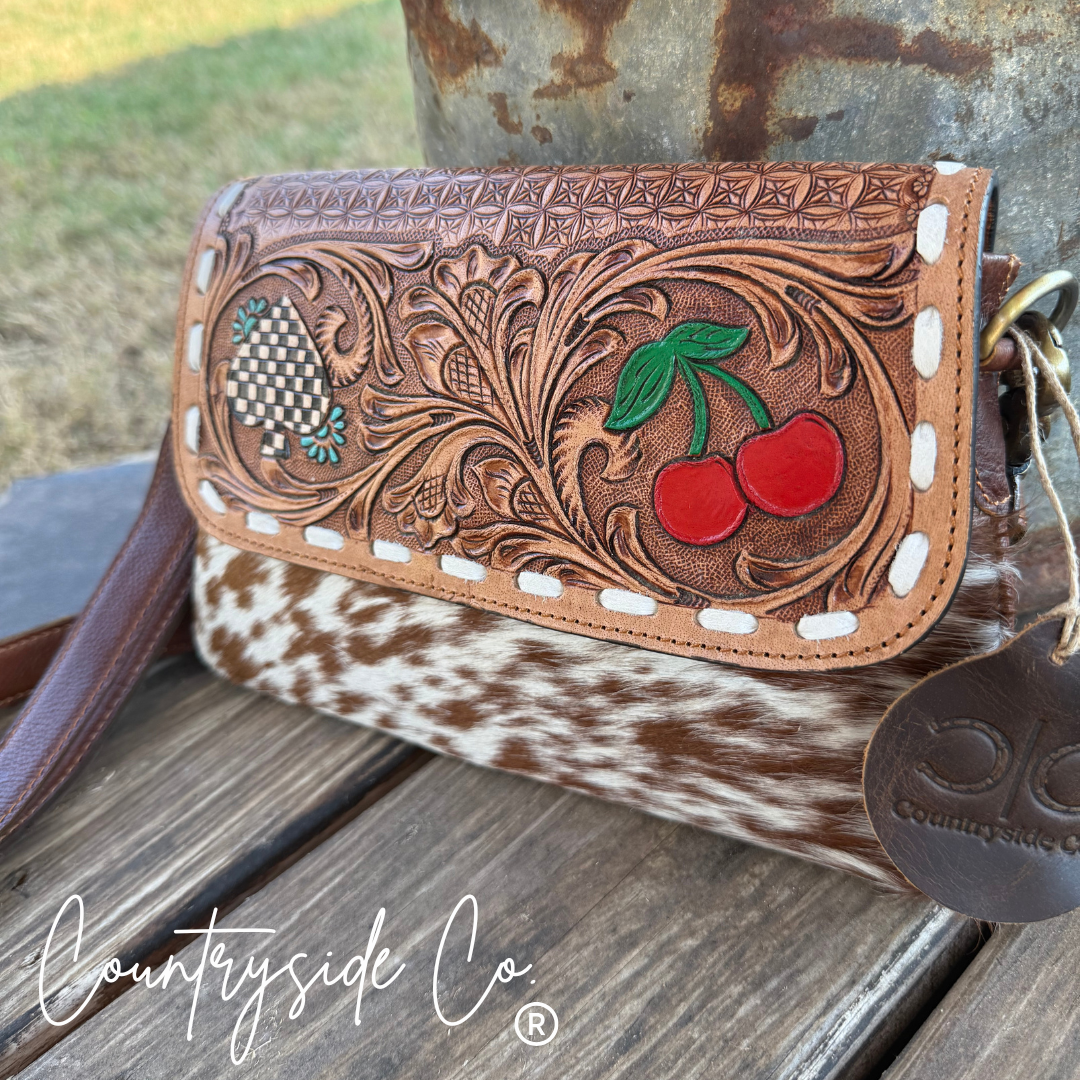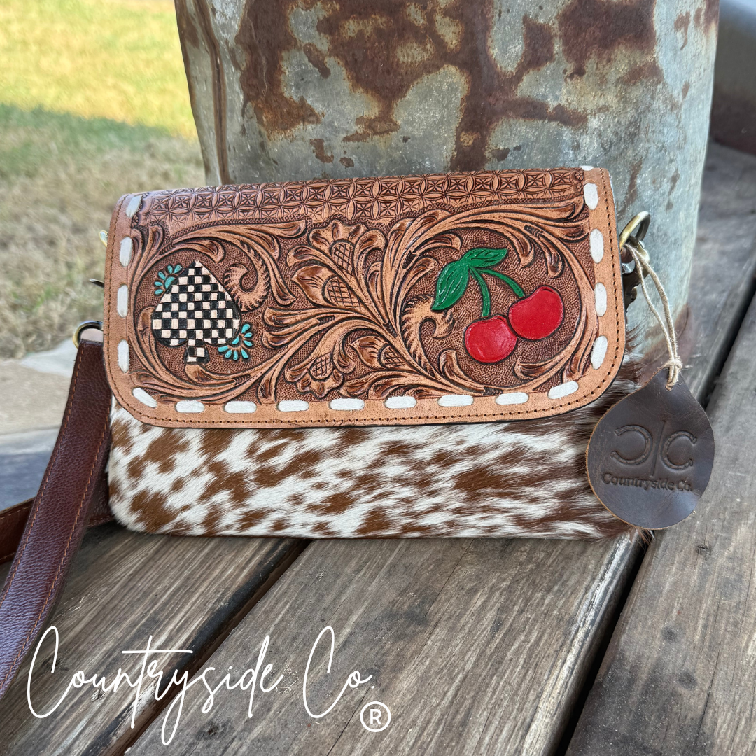 This Lucky Charm Leather and Cowhide Purse brings a playful touch to your style with its cowhide front and a tooled leather flap featuring a hand-painted cherry and checkered spade. Secure your essentials with a zip closure while enjoying versatility—carry it as a chic clutch or attach the detachable shoulder strap for hands-free fun. The smooth leather back adds comfort and durability to this unique accessory that’s perfect for adding a bit of charm to any outfit. Hand-painted with care, each piece has its own unique character, allow for minor imperfections.