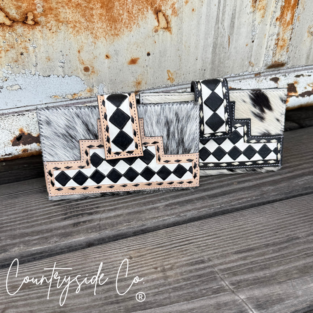 Introducing the Miranda Checkered Cowhide Wallet—where rugged meets refined. This standout piece features genuine cowhide on both front and back, with a striking checkered pattern available in your choice of brown or black accents. The reliable snap closure keeps your essentials secure while you're on the move. Whether you're heading to town or the ranch, this wallet brings a dash of personality to your pocket with authentic leather durability that only gets better with time.