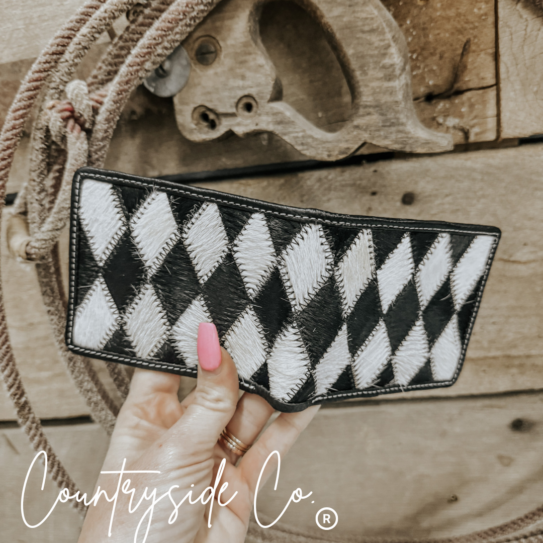 Indulge in luxury with The Westin Cowhide Mens Wallet by Countryside Co. Crafted from diamond checkered cowhide and genuine leather, this wallet is both stylish and durable. Stay organized with its unique design while making a statement. Elevate your everyday routine with this must-have one of a kind accessory.