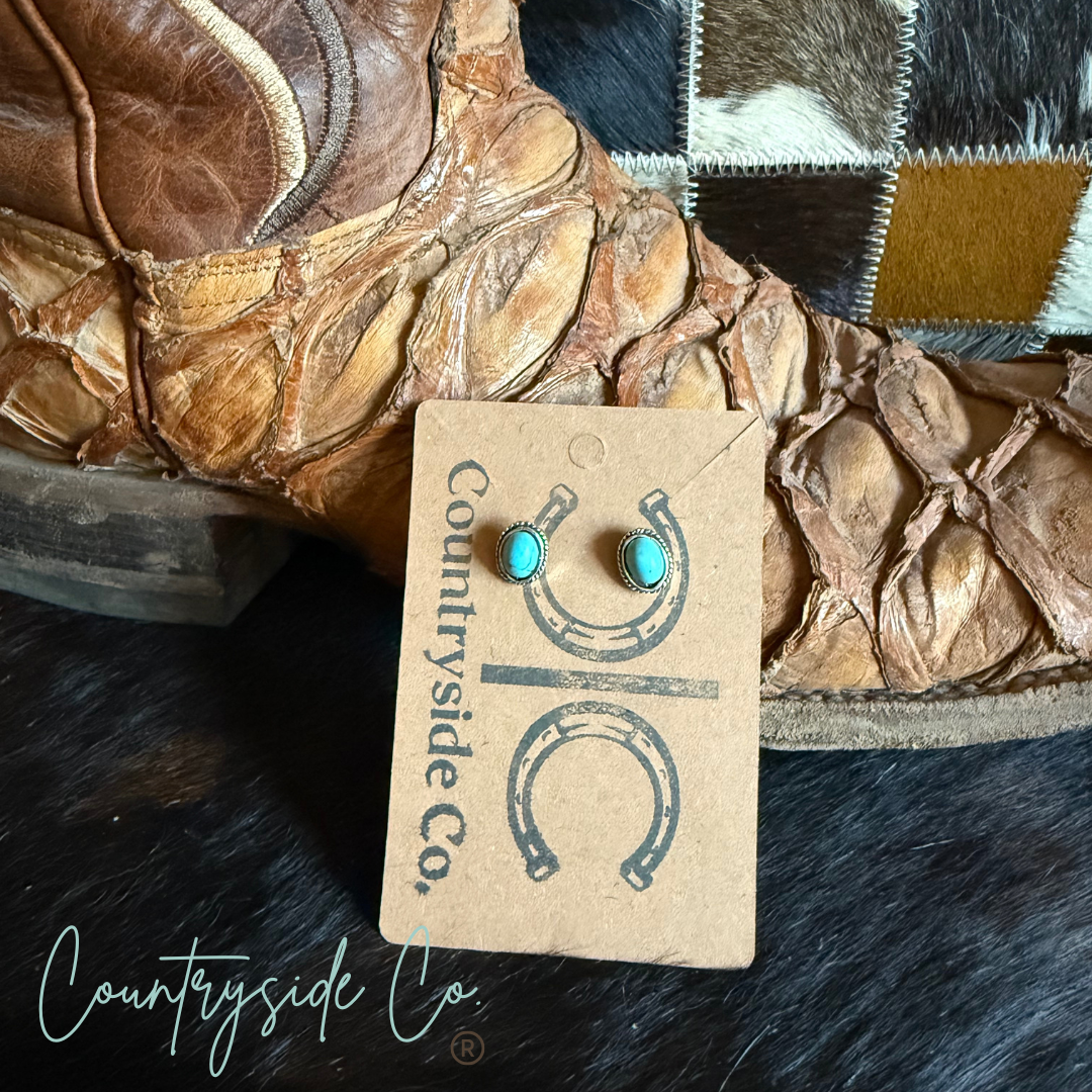 Add a splash of color to any outfit with our Turquoise Oval Earrings. These bold but small, western-inspired earrings feature an detailed silver setting that features a faux turquoise stone. Small enough for everyday wear, yet distinctive enough to make a statement. Measures 1/2 inch
