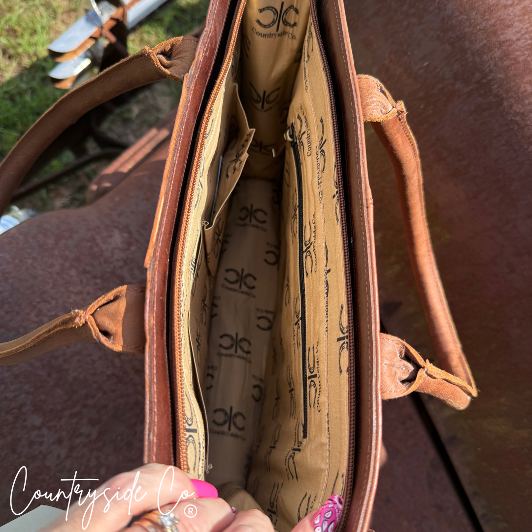Virginia Cowhide Checkered Concealed Carry Tote Handbag by Countryside Co. is the perfect statement bag. It is large enough to carry everything you need and still is easy to carry with style. It has cowhide checkered with tooled leather front with a leather back. The back has a zipper compartment and the inside has two side pockets and one zipper side pocket. Virginia has zipper closure to keep everything in place and a detachable adjustable shoulder strap. Made with genuine leather.