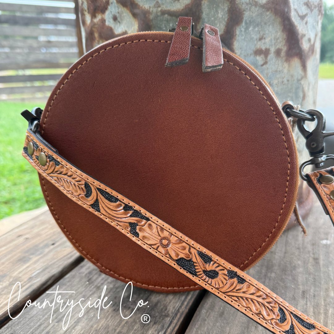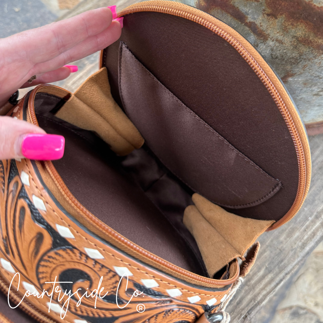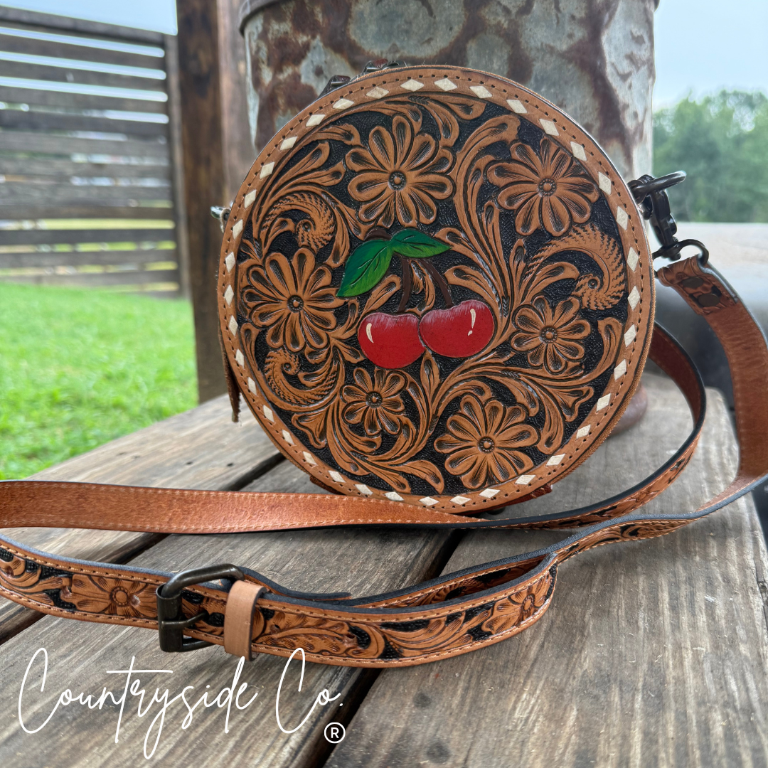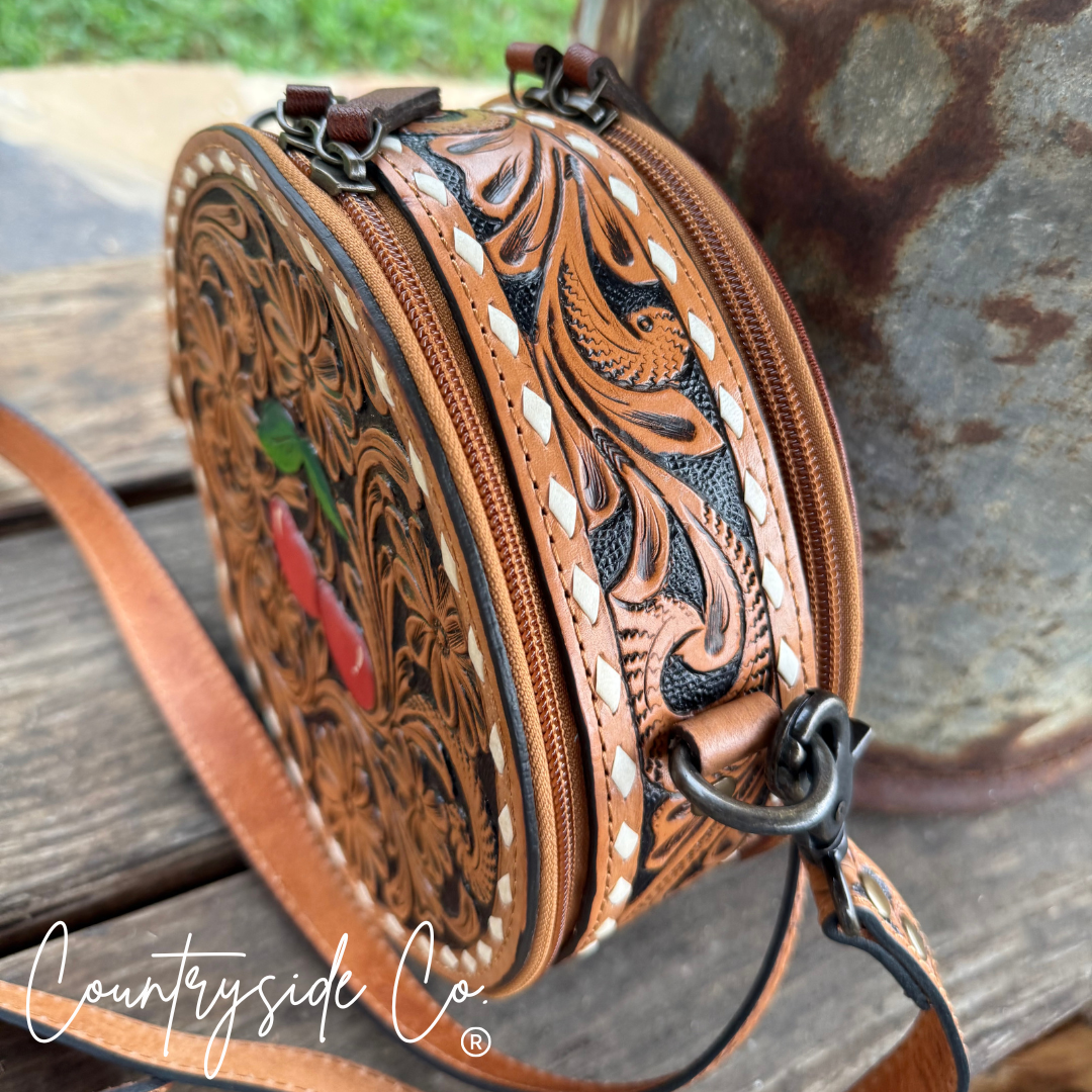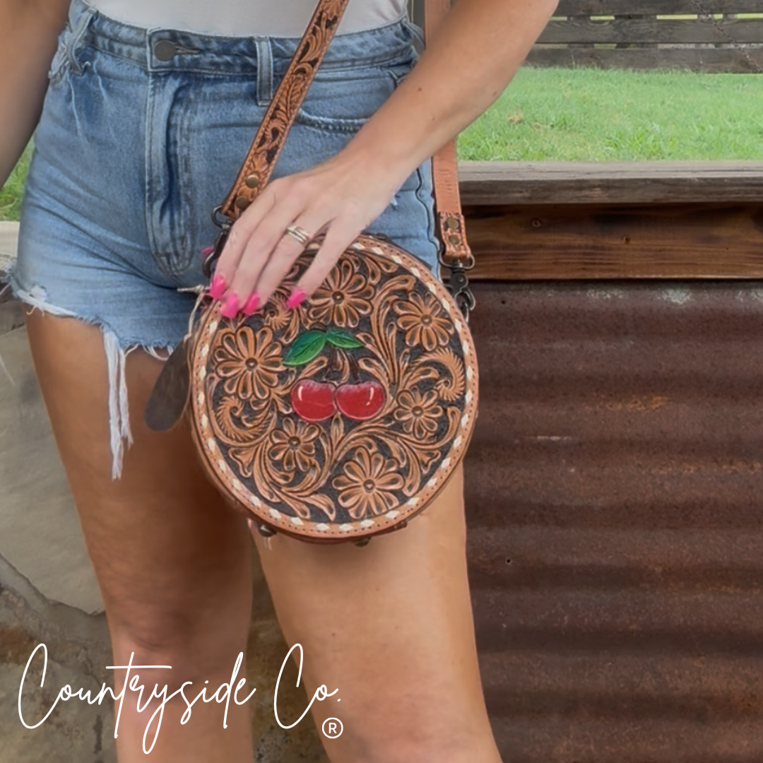 This Wild Cherry Tooled Leather Canteen Purse is a charming blend of style and function. Crafted with tooled leather on the front and sides, and a smooth leather back, it offers a unique texture you’ll love to touch. The adjustable tooled leather strap lets you wear it just right, while two zipper openings keep your essentials organized, each with a handy side pocket. Finished with brass feet on the bottom, it stands out with a playful yet practical flair wherever you go.